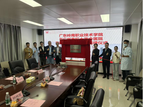 随后,庄重而简朴的揭牌仪式正式举行。广州市红十字会医院院办王晓曼院长、医院科教科李广科长对我院一行的到来表示热烈欢迎。医院强调,与职业院校共建实训基地是医院履行社会责任、储备优秀技术力量的重要举措,期待通过深度合作,共同探索出临床与教学互促共进的有效路径。 叶桂荣院长对医院的鼎力支持致以诚挚谢意。她表示,此次合作是我校深化教育教学改革、实践教学基地建设的关键一步。“将课堂延伸到病床旁,让教学紧跟技术发展”,她期望以基地为平台,实现师资共享、课程共建、人才共育,培养出更多“下得去、用得上、留得住”的高素质康复治疗师。 在热烈的掌声中,双方领导为“广东岭南职业技术学院教学实训基地”揭牌。红绸揭开的不仅是一块牌匾,更是协同育人、共谋发展的坚定承诺。