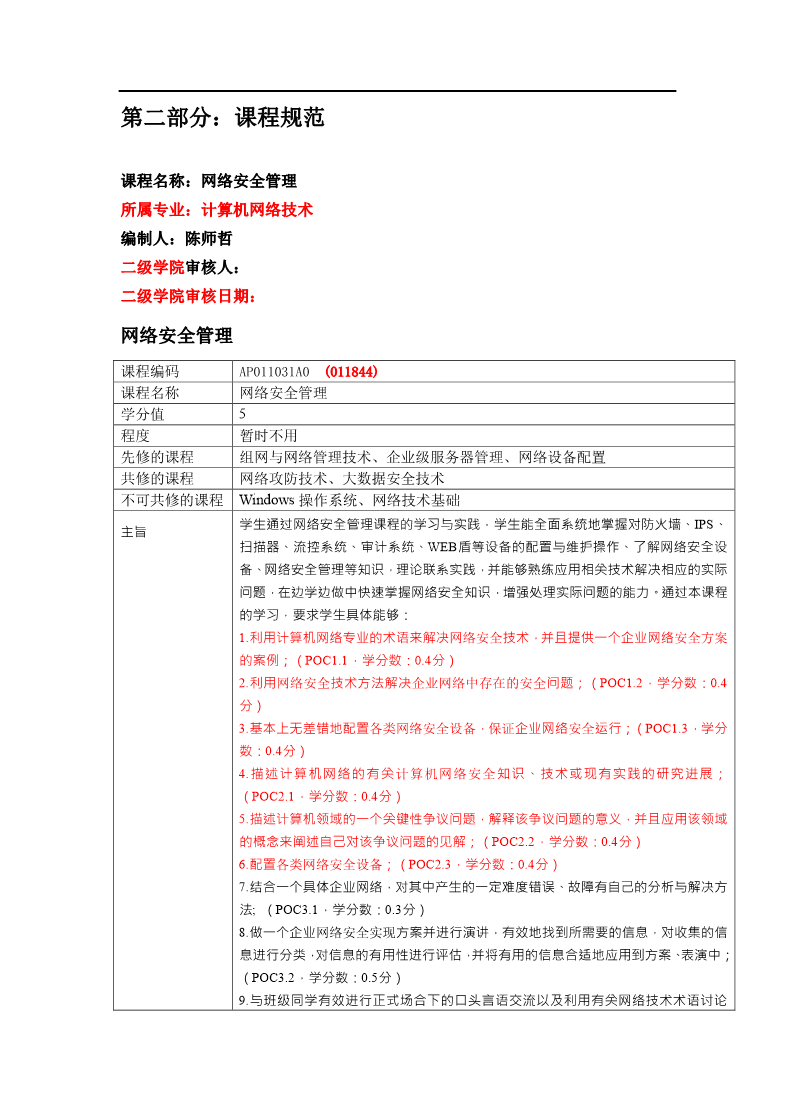 计算机网络技术专业《网络安全管理》课程教学诊改案例-课程规范