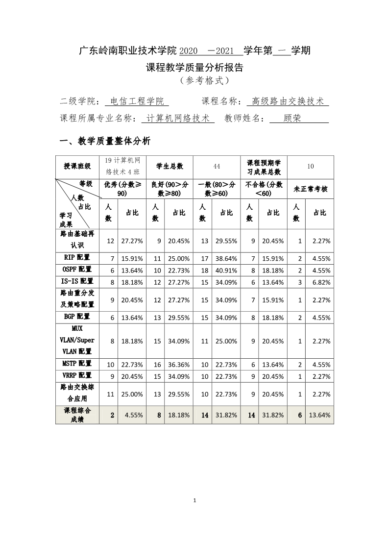 计算机网络技术专业《高技路由器技术》课程教学诊改案例-课程教学质量分析报告