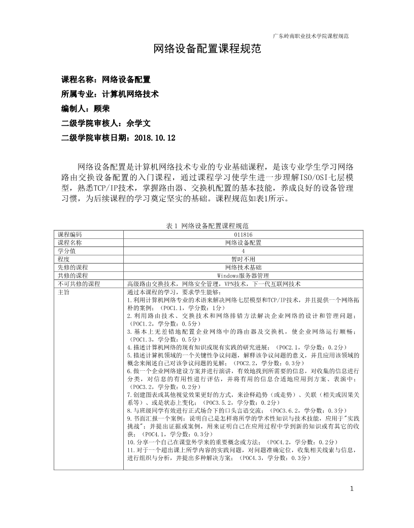 计算机网络技术专业《网络设备配置》课程教学诊改案例-课程规范
