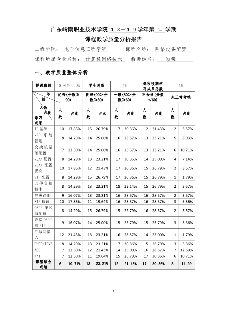 计算机网络技术专业《网络设备配置》课程教学诊改案例-课程教学质量分析报告