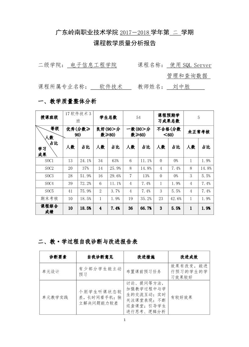 软件技术专业《使用SQL Server管理和查询数据》课程教学诊改案例-课程教学质量分析报告 来源: 发布时间:2018-07-21 09:35:40 浏览次数: 次 【字体:小 大】 分享到: 【打印正文】