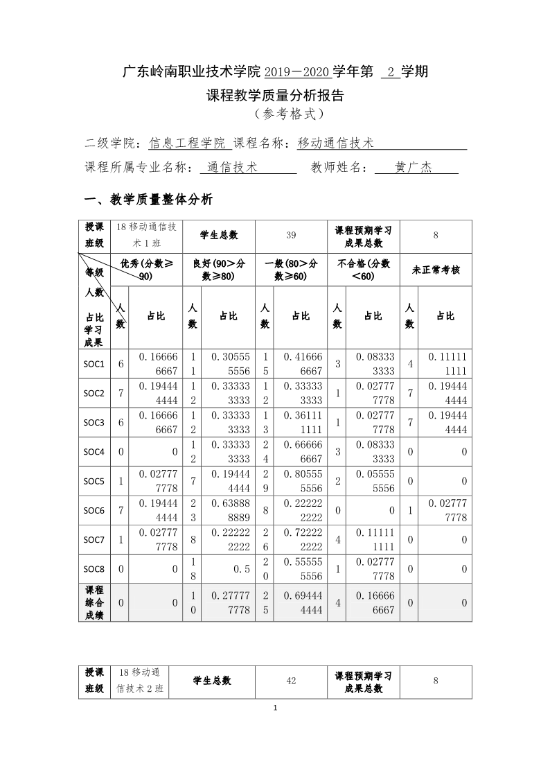通信技术专业《移动通信技术》课程教学诊改案例-课程教学质量分析报告