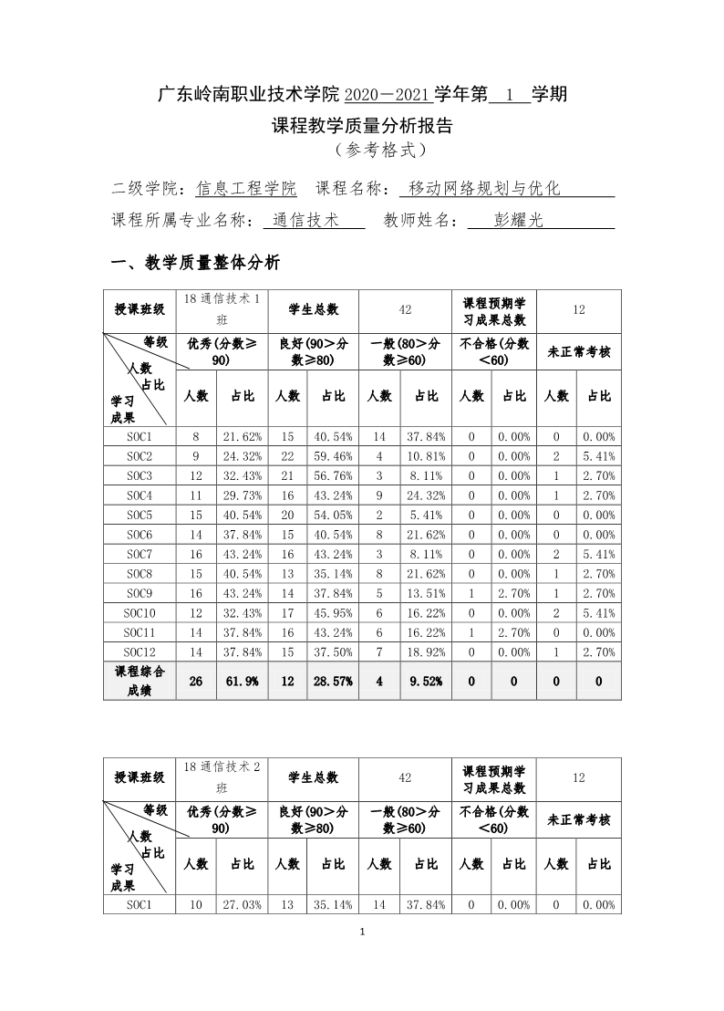 通信技术专业《移动网络规划与优化》课程教学诊改案例-课程教学质量分析报告