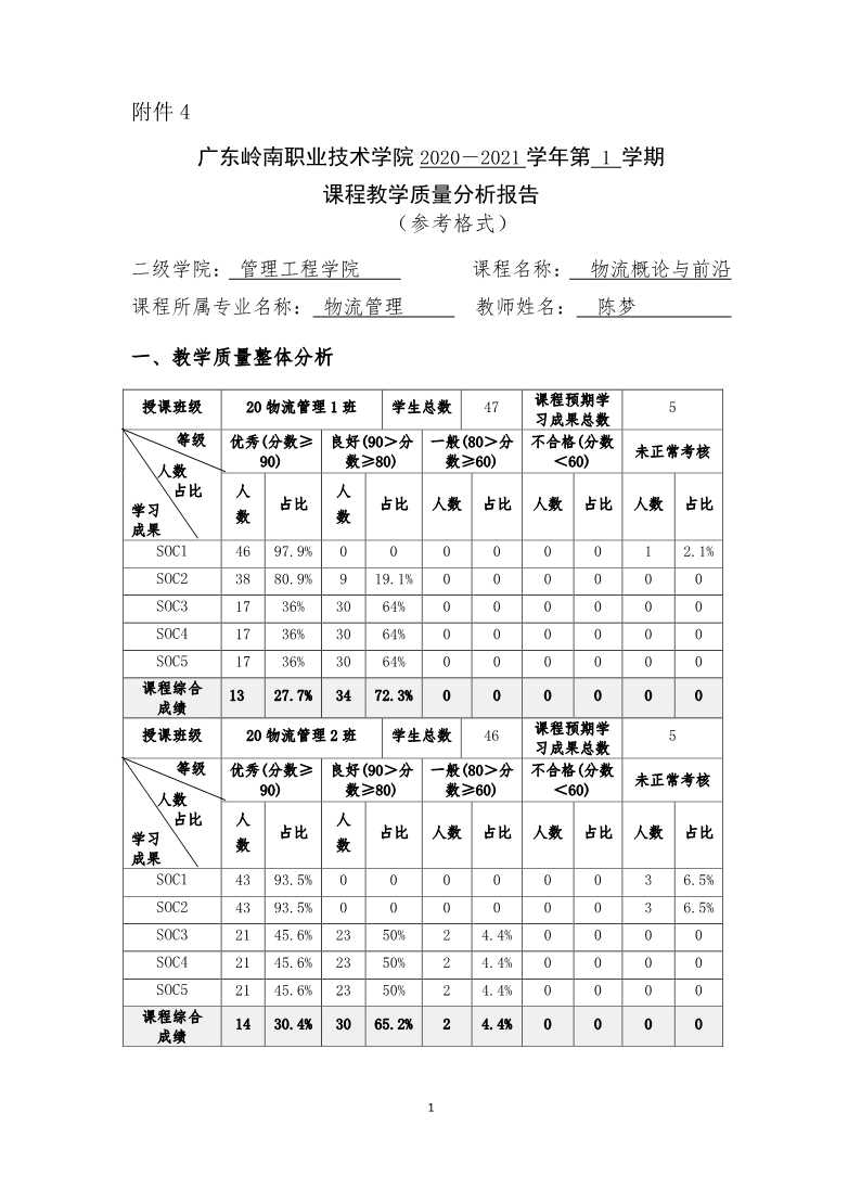 物流管理专业《物流概论与前沿》课程教学诊改案例-课程教学质量分析报告