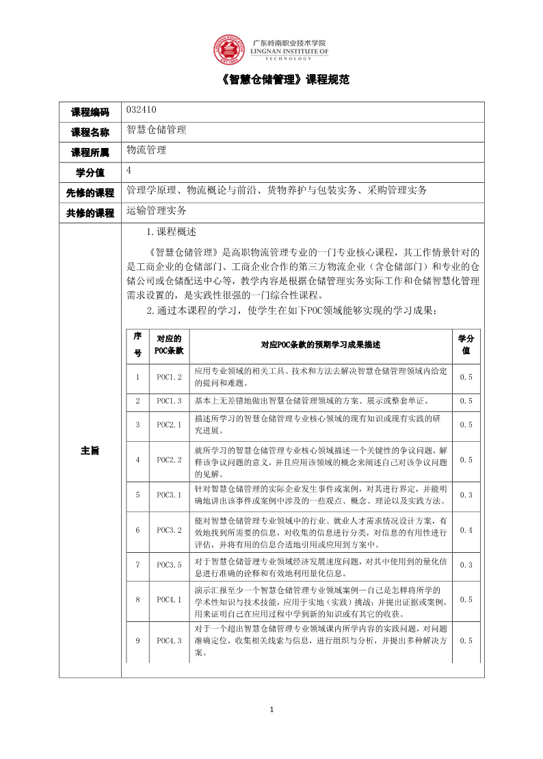 物流管理专业《智慧仓储管理》课程教学诊改案例-课程规范