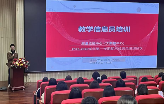 2025年12月11日,质量监控中心(大数据中心)在清远校区图书馆报告厅举行2025-2026学年第一学期教学信息员期末总结与培训会议,质量监控中心(大数据中心)副主任郭放和141名学生教学信息员参会,会议由质量监控中心(大数据中心)岳韩钰老师主持。