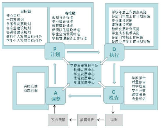 PDCA循环是指高职院校通过P(计划)、D(执行)、C(检查)、A(调整)循环,建立内部质量保证体系,实现学校内部质量控制目标的达成。在PDCA循环的计划阶段,找准诊改的起点,打造“目标链”与“标准链”是首要任务。目标链由学校发展核心目标、“十四五”规划等组成,通过学校的各项规划任务确定诊改工作目标任务,明确了人才培养的基本方向。标准链由学校按照专业、课程、师资队伍建设、学生全面发展等各项标准确定,通过现状与目标的比较发现问题和偏差,从而找到改进的方向和办法;在执行阶段,学校推动各项工作任务的实施不断接近质量目标的设置值。在检查阶段,形成诊改报告、质量报告等评估数值是否达到目标值和标准值,监测数值一旦偏离目标值过多,将发布预警。在调整阶段,通过实际值与目标值的对比进行动态纠偏。诊改工作是一个螺旋上升的过程,质控点要根据实际变化而不断优化调整,让诊改工作起到支撑学校质量稳步提升的作用。