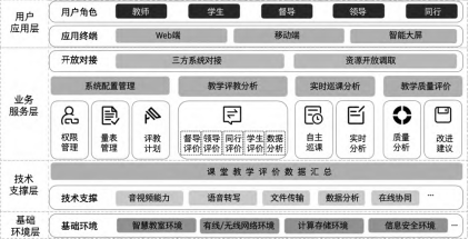业务服务层:一方面,为用户层提供系统管理配置、教学评教分析、实时巡课分析和教学质量评价等应用功能;另一方面,对外提供开放接口,提供统一身份认证、统一权限管理、统一数据采集、录播转码、资源调取等服务接口,为平台与第三方应用提供服务。