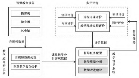 AI教学督导评价系统是一个高度集成的智能化信息系统,涵盖了智慧教室中的摄像机、拾音器、电脑、AI分析设备以及教学督导软件等。智慧教室安装的摄像机、拾音器和电脑等设备可采集课堂的音频和视频数据,并通过网络将采集的数据传输到教学AI分析设备。教学AI分析设备对课堂的音频和视频数据进行处理和分析,并将分析的结果数据传送给教学督导评价系统。依据教学AI分析设备提供的教学行为分析结果数据,以及督导、领导、专家、同行的评价结果数据,教学督导评价软件进行教学综合质量分析,并提供教学改进建议。图3为AI教学督导评价系统的数据流向图。