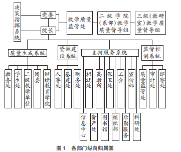 基于“诊改”理论,按照决策指挥、质量生成、资源建设、支持服务、监督控制五个系统,从五个维度出发,科学构建“学院—专业—课程—教师—学生”五纵联动体系。该体系明确了各部门的归属,强化了各层级之间的质量依存关系,同时构建各系统的保障部门,以此确保各个部门的工作能够有效实施及运行。其各部门纵向归属如图1所示。