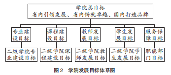 我院依据国家职业院校发展规划,以进一步打造特色专业、建设省级卓越院校,建立更多星级专业等作为学院发展的核心导向,制定了我院总体发展目标。然后对总体目标进行细化分解,确立各二级部门及职能部门的发展目标,落实各自的部门工作计划与具体任务,实现目标任务的逐级分解,并准确传递至专业、课程、教师、学生层面,形成上下衔接、横向贯通的目标体系。学院发展目标体系如图2所示。