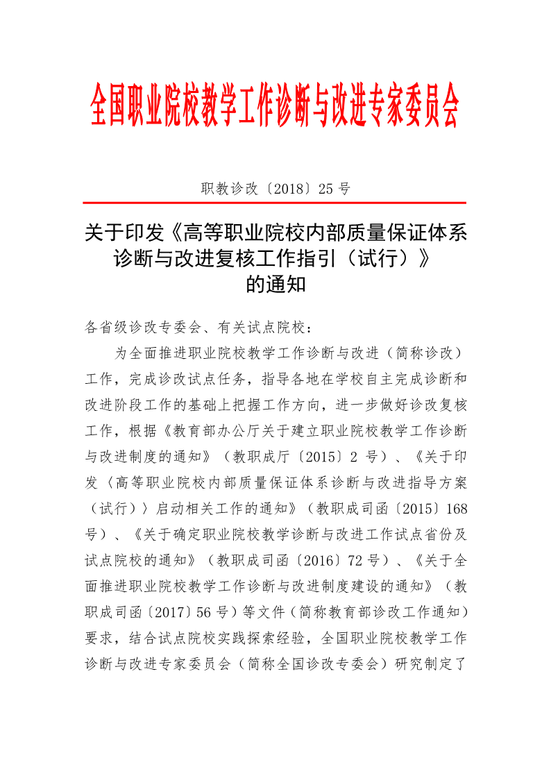 高等职业院校内部质量保证体系诊断与改进复核工作指引(试行)职教诊改〔2018〕25号