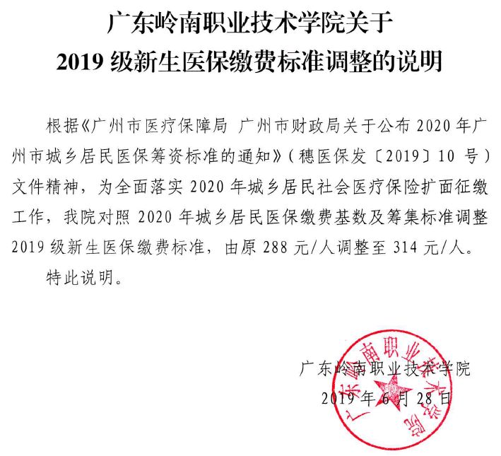 关于2019级新生医保缴费标准调整的说明